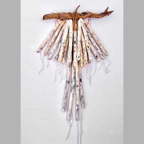 The artist has been busy with artwork and travel, creating two colorful totems for a gallery. The first piece features blue hues with turquoise leather cording, while the second, longer piece incorporates softer colors and rusted fencing wire. Both artworks reflect the artist’s dedication and creativity in their assembly.