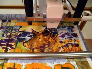 I am in the process of quilting the last Studio Tour quilt. I am using my mid-arm quilting frame and my Pfaff sewing machine.