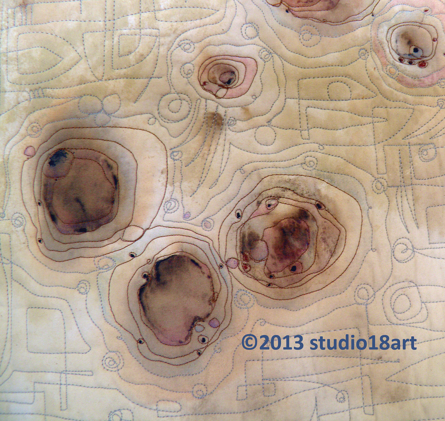 I also used this technique in another piece, but employed very subtle color, and it has a totally different effect. In the first sample, I quilted the background with a great deal of motion, but in the example below, the background is much more free, with non-directional energy. This sample reminds me of a worn leather jacket…worn because it is your favorite and can’t be let go.