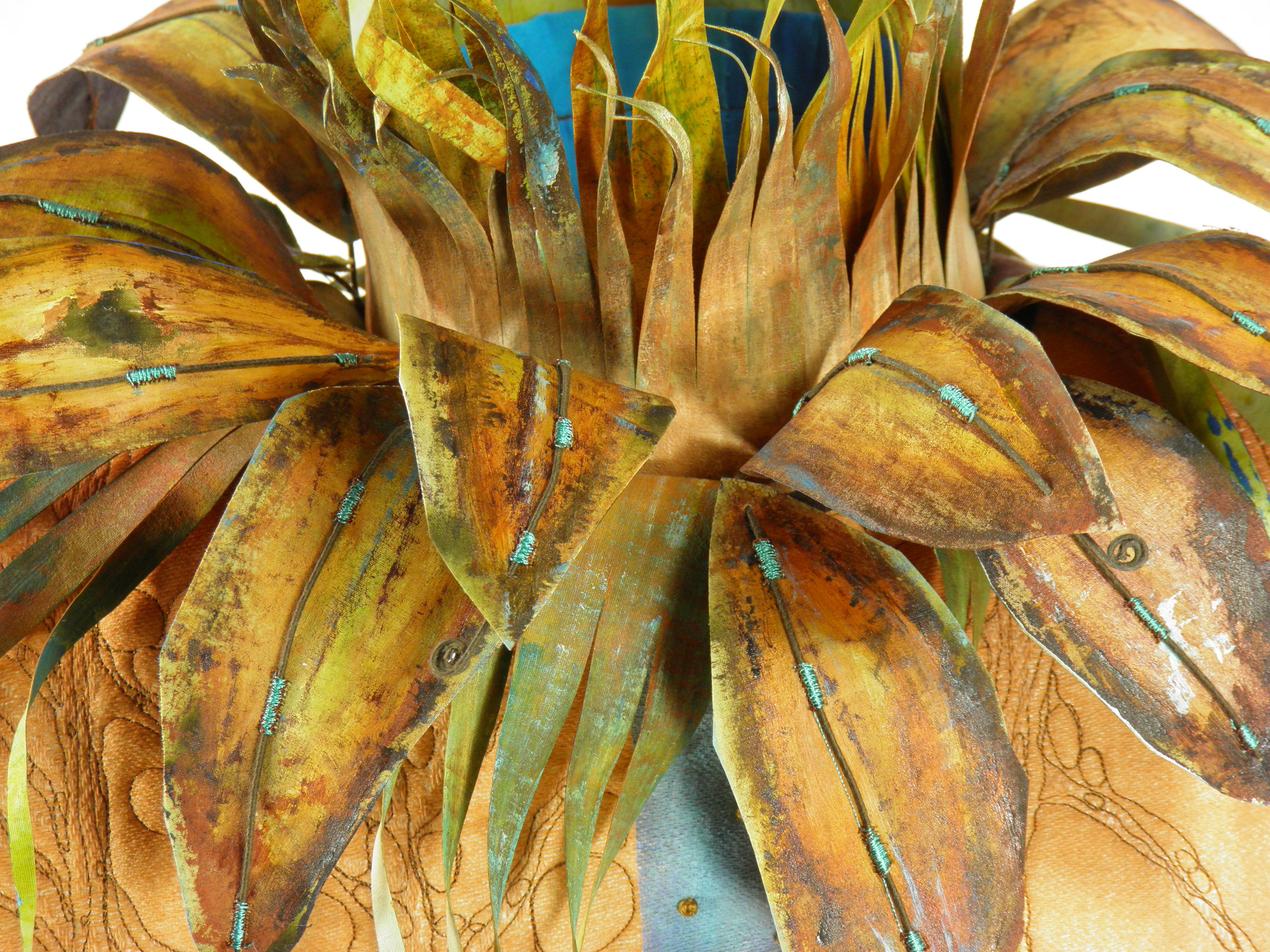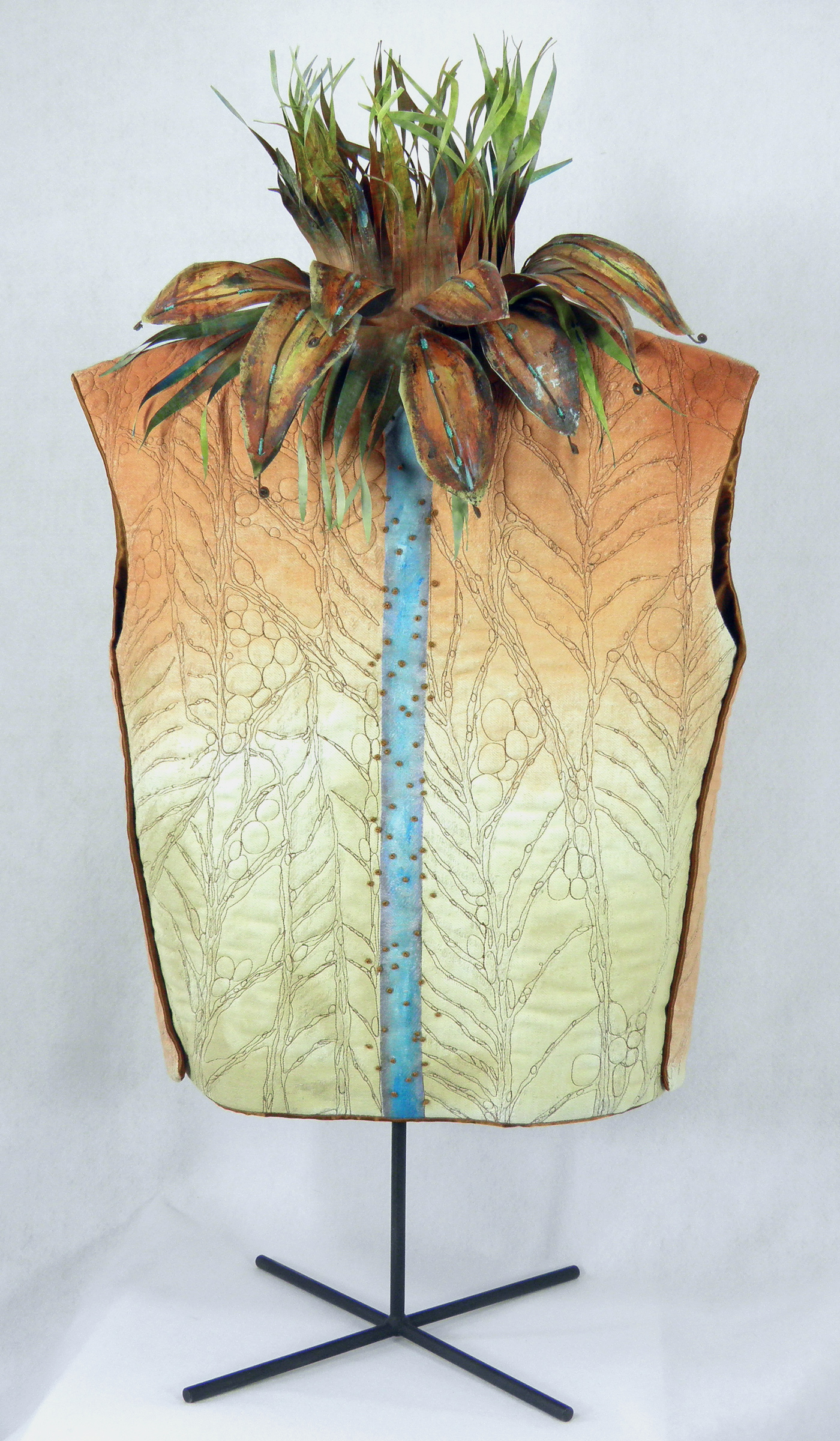 I used a few different techniques in the construction of the piece. The bust is painted on a textured linen and then quilted. The blue “river” travels down the front and back of the piece, dotted with pearl cotton french knots. (There are times I love to hand embroider…quite relaxing.) The leaves and grasses are painted cotton, as I have done in other dimensional work, but I have shaped the leaves to stand away from the neck.