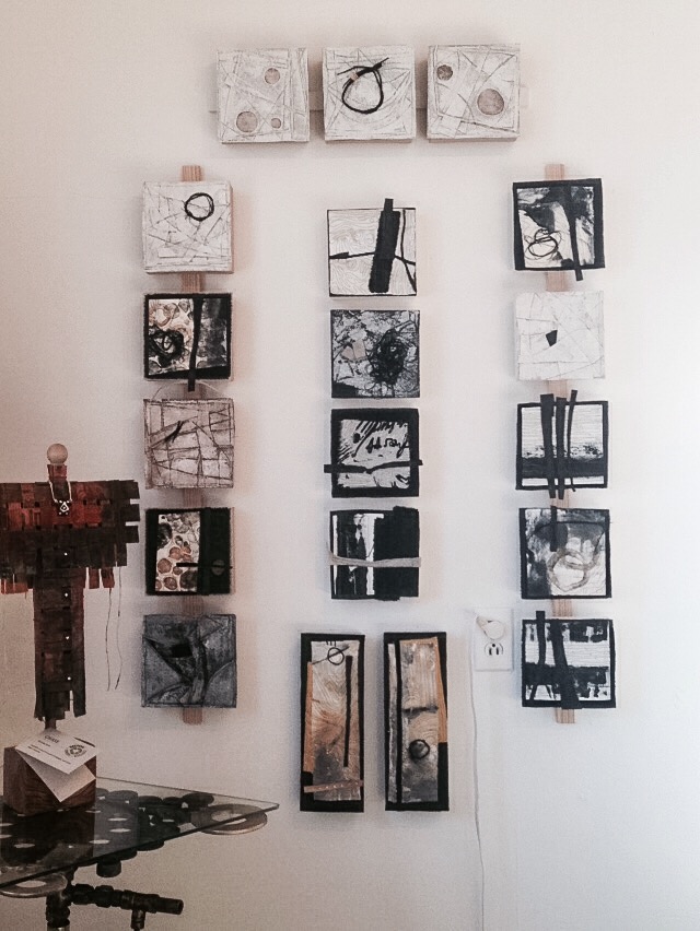 I hung some new work in the studio today. I have been experimenting with felt and stitching and painting and cutting and quilting AND “embroidering”…and viola! Most of these pieces are six inches square, mounted on canvas, and sold individually or in totems of five or three pieces. I am working on more rectangular shapes and on larger pieces, 20×20 inches square. So enjoyable…from the Madrid studio