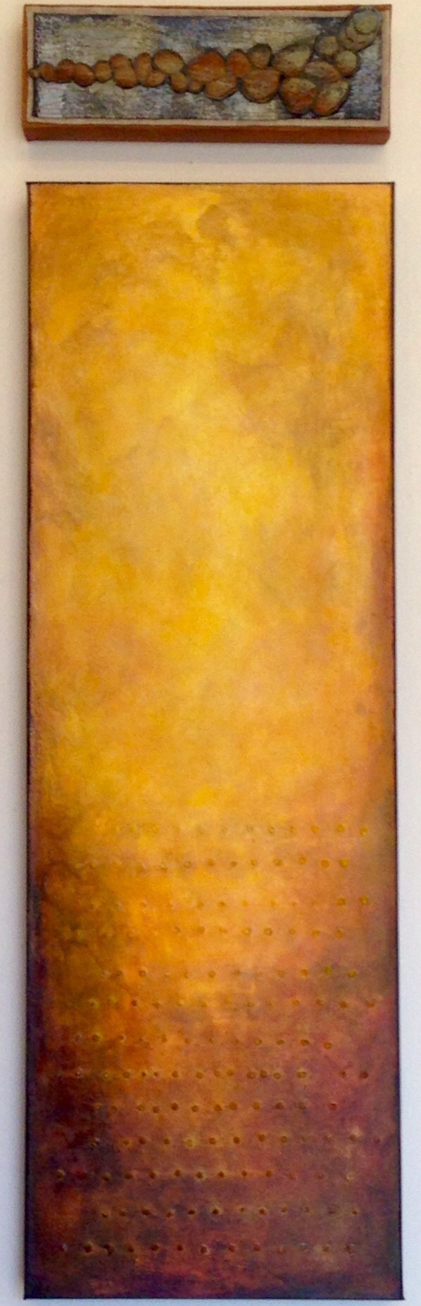 I found these two pieces lived well together. The top piece is a felted construction, painted, layered and quilted. The bottom piece is a yellow/purple combo, with very loosely applied textural dots. I was hoping the two would sell together, but alas, they sold separately. Each was created on its own, but they truly complimented each other.