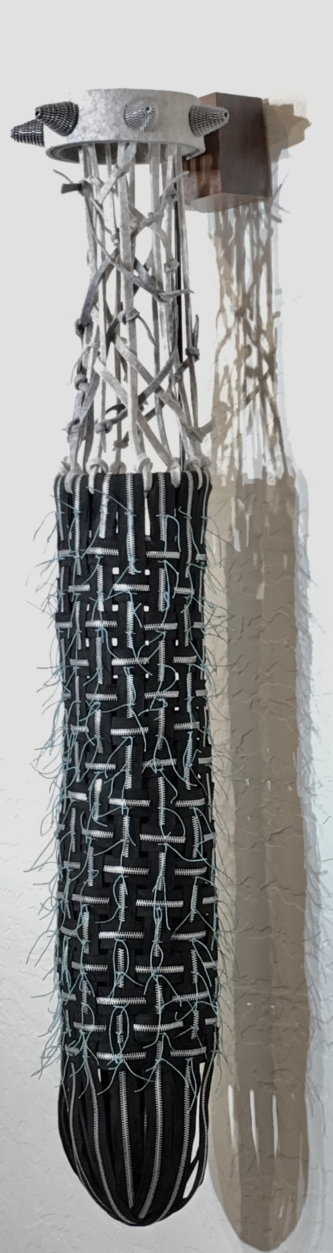 This is the second hanging basket in the Strings Attached series..BLACK HOLE. I used the same materials as in a few other baskets…zippers, waxed linen thread and industrial felt. One stitch of turquoise waxed linen thread at each intersection of the zippers keeps the basket in the wasp nest shape, yet it remains soft and flexible. The finished piece hangs from a wooden block on the wall.