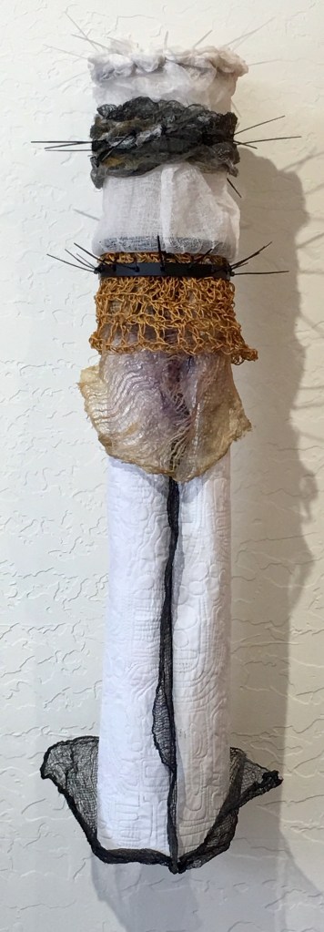 The top section is supported both top and bottom, comprised of cheesecloth held with zip ties. The bottom section, also attached with zip ties, is topped with a crocheted cap. I hadn’t crocheted in many years, but found I hadn’t forgotten the simple stitches…okay, it took a bit (i.e. a LOT) of practice, but the results were worth it. Now that I know what I am doing, I will gladly create more. The cap is followed by dyed cheesecloth and a quilted tube of white. I had painted and quilted a large piece, but found it did not appeal to me when it was complete. I loved the quilting, so I thought if I painted it white, right over the quilting, it may be better. As a large piece, no, but when cropped to a smaller size, viola! It became the perfect base and contributed nicely to the white light theme. It has good rigidity, lending a firm, but sleek, profile to the completed basket.