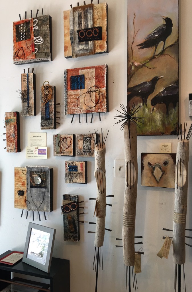A glimpse into what I’ve been doing the past few weeks…textiles and paintings, both fun and rewarding. Joining the group are three Desert Sentries created by my talented husband. Our work dances well together.