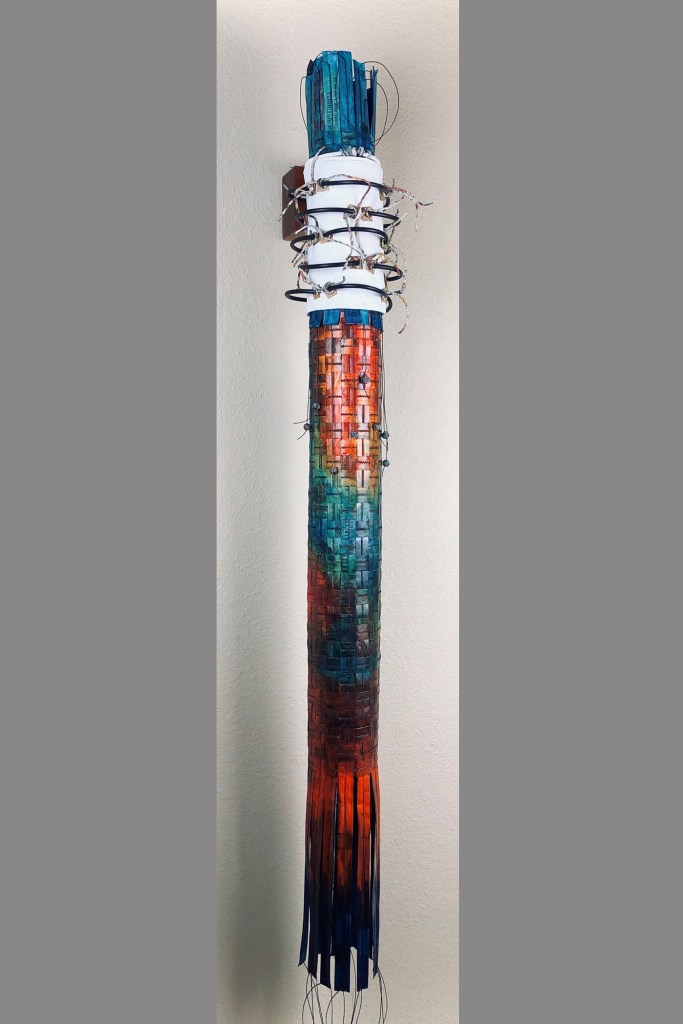A few posts ago, I gave you a sneak peek at part of this piece…the “headdress”. It is composed of a quilted fabric embellished with irrigation tubing and newspaper yarn. The body of the piece is made from newspaper, sewn with a cording and woven.