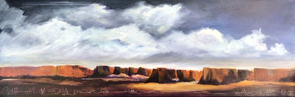 Waldo Canyon Wind is the painting that sat on my easel for about three days while I contemplated what I needed to do with the sky. I wanted some direction to the clouds, started to place a few and, voila, I saw the wind pushing them along! Sometimes the right answer takes a while to materialize…worth waiting for. I so enjoy painting the landscape of New Mexico.