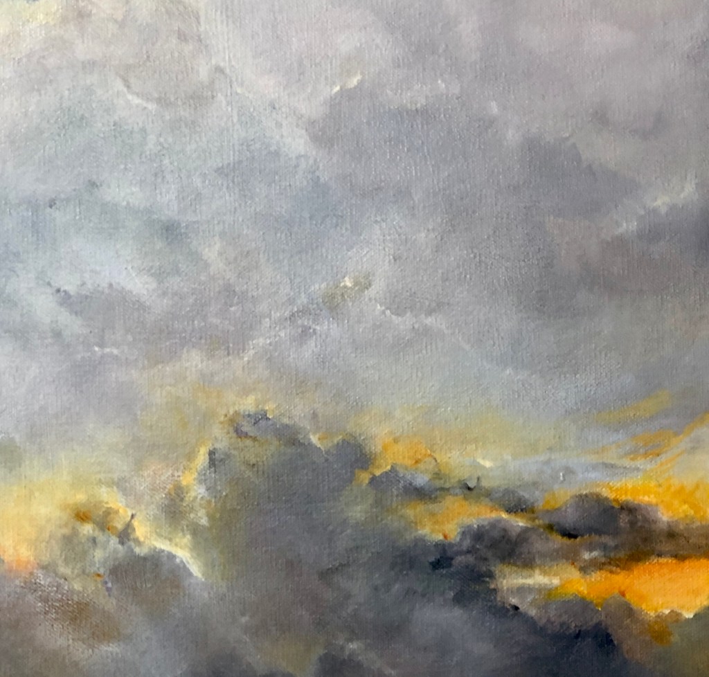 I chose a vertical format for this piece because I wanted to place a darker cloud near the horizon and I didn’t want it to overwhelm other elements in the painting. Keeping a good deal of breathing room around it, especially above it, allowed it to be attention getting, but not dominating. I am currently working on two horizontal landscape paintings with a darker floating cloud mass and will work to keep those masses from crowding out all else on the canvas.