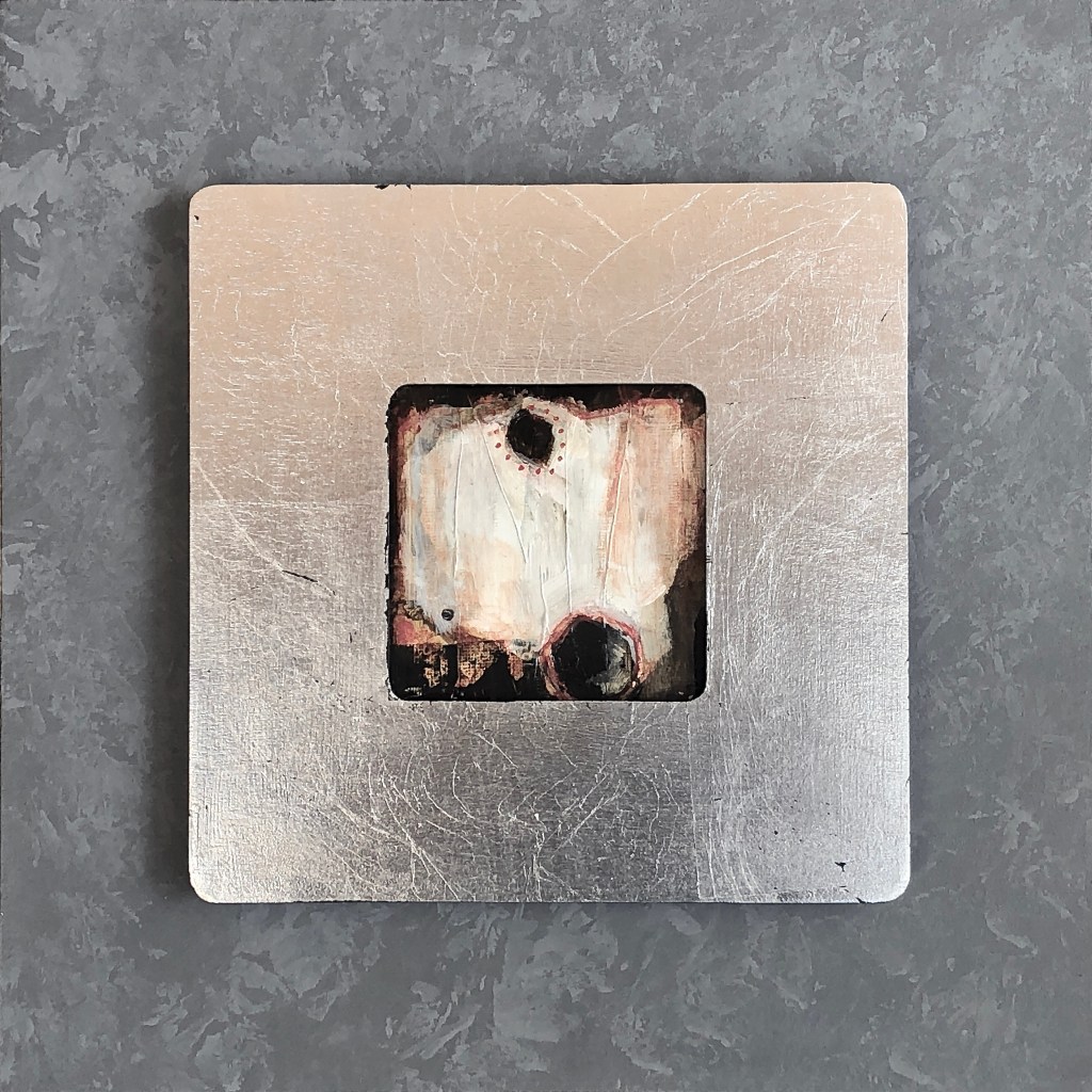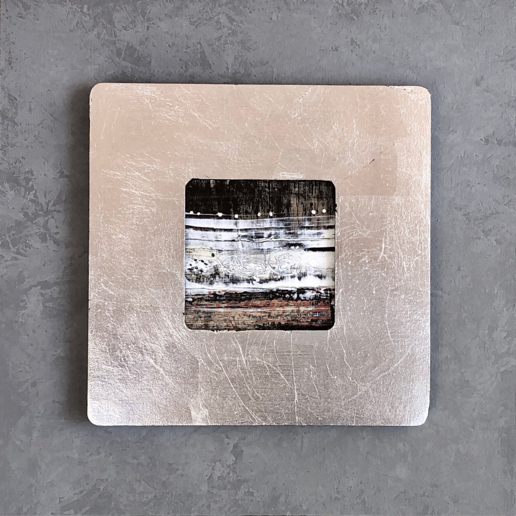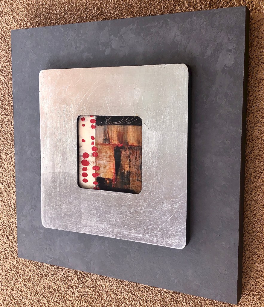 As I previously mentioned, I spent a great deal of time developing a presentation that I like for my small paintings. The angle of the photo above depicts the layering I used. Though it took a few twists and turns, it turned out close to what I originally pictured in my head. Over many years of making art, I learned through experience not to get ahead of myself by doing the miniature abstracts and then trying to figure out a way to frame them. It would have been easy to just put them in a mat and frame, but…..