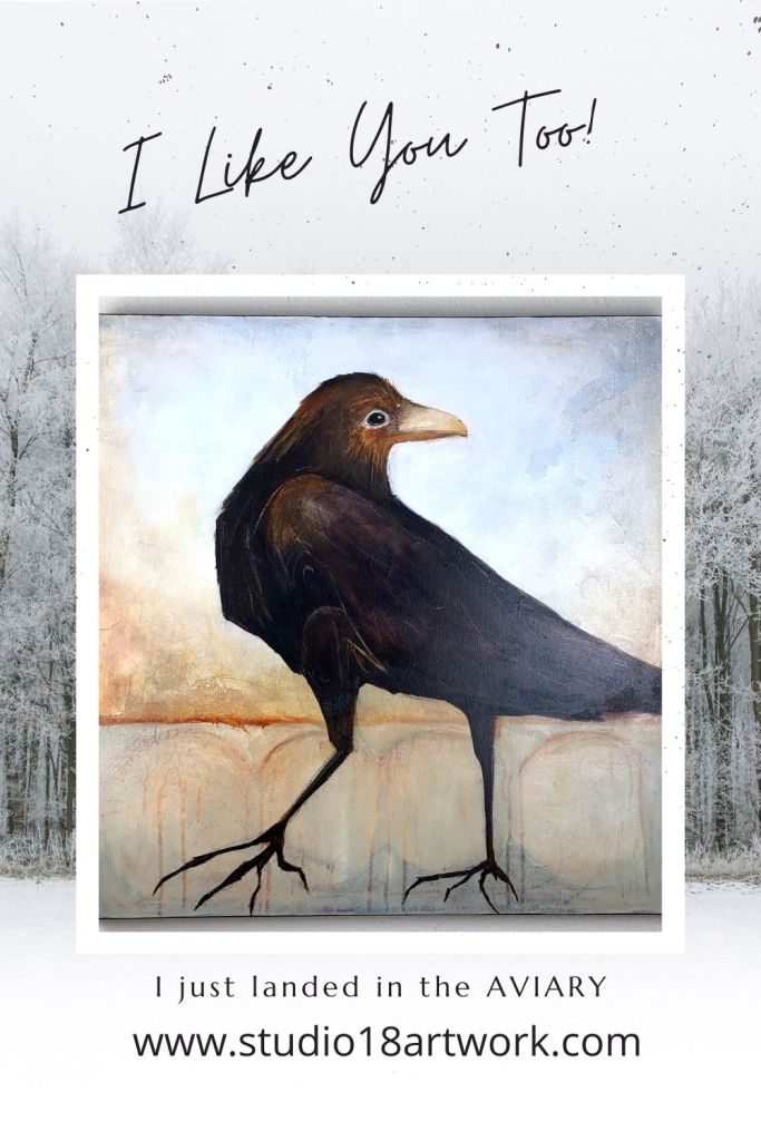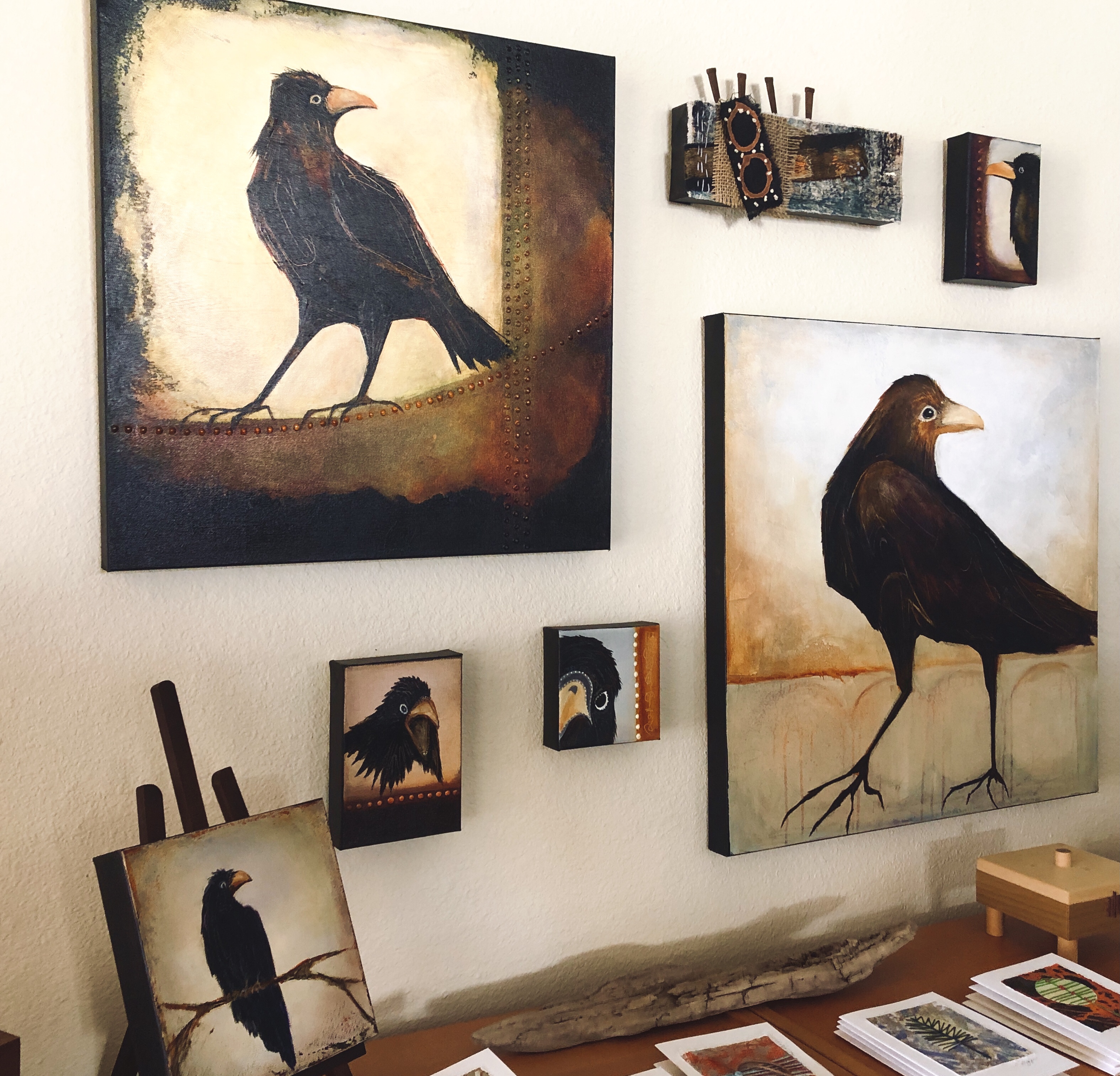 A few of the ravens on canvas (that are now available in the AVIARY) are now on my studio wall…looking good…keeping me company….from the studio
