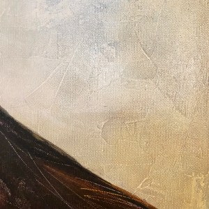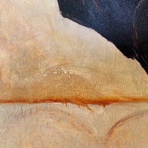 I textured the background with a generous application of gesso and then layered, layered, and LAYERED with acrylic paint, each complimenting, and then obscuring, the previous layer. The result is a subtly nuanced surface that suggests a dreamy landscape…a shy bird with gentle eyes…a slightly flirty response. Two examples of the texture: