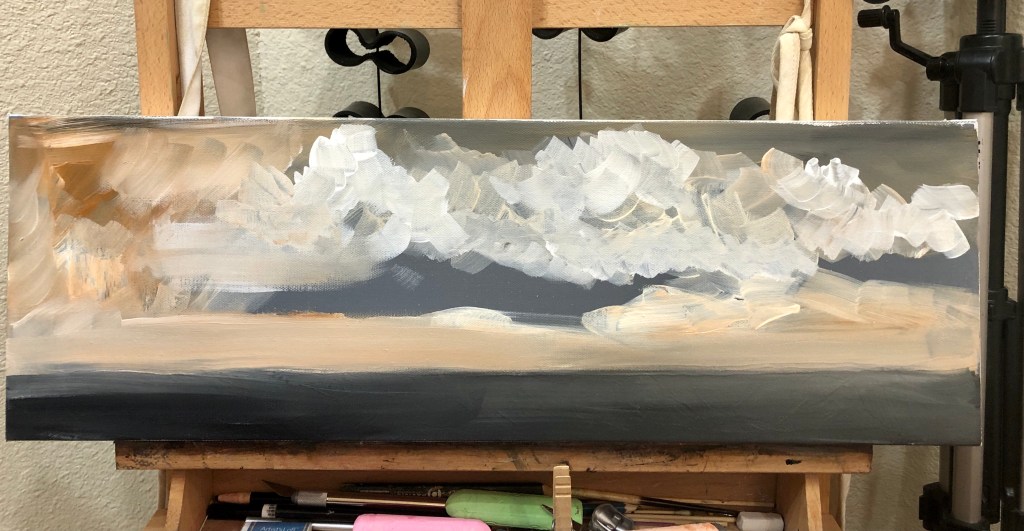 The canvas on the left has three coats of gesso and is a beautiful tone and the canvas on the right has been under-painted with a general layout for the clouds…the ground not touched, remaining the same gray undercoat. Sometimes the underpainting is more active as in the image below, and lends an energy to the piece…thoughts that can be changed along the way.