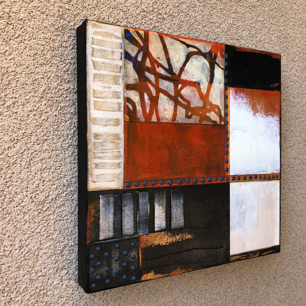 This painting and the following two are part of a sub-series within the Limited Vocabulary series. (Sounds like diagraming a sentence…remember?). BUT, this is important as I will continue this series over the next year. The paintings in this “12 days x 12 months” series will all be 12×12 inches in size, with each depicting a day in the life…random days…random emotions…random events. Hopefully, when viewed together, a simple, happy existence will be portrayed and enjoyed. I guess it will be similar to my own life. Artists tend to draw from their own experience and this is no different.