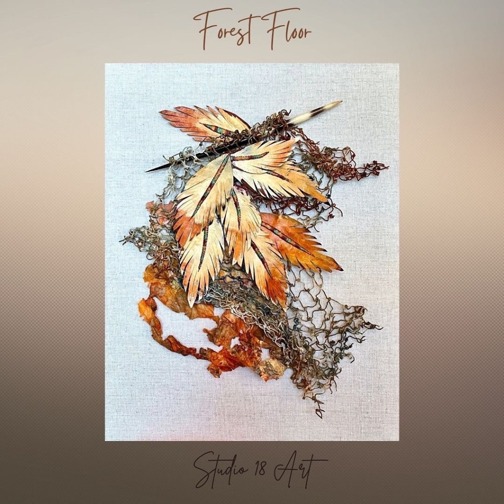 The second of four new framed textile pieces heading to Jupiter Fine Art today. Yes, the feathers have made a comeback due to some requests. Fortunately, I had some single feathers left from previous projects so I could jog my memory as to how I created them. My only issue was with my sewing machine. I had to take out my old Bernina…very old…to sew on the feathers. My newer machine, although claiming to do a thousand and one things, could not be controlled as needed. Once I started on my old friend, things went well. I think I will continue sewing with it for a while…old friends are the best! …from the studio