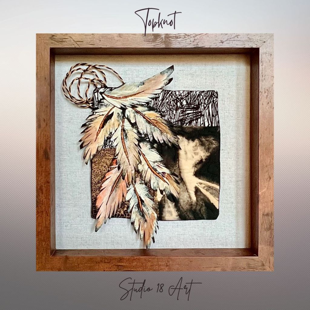TOPKNOT is a smaller textile piece…9×9…a more neutral piece started with the fabric in the lower right corner. A LONG time ago, I ordered black fabric that discharged to white, or, if you halted the process a bit sooner, to a lovely cream color. I used that fabric in many pieces over the years, but when I went to reorder, it was no longer available. I seem to have that kind of luck! SO…I am using what I have left very judiciously. This piece came together smoothly, following the lead of the cream and black block. When something just speaks to you as an artist, you can’t go wrong…from the studio