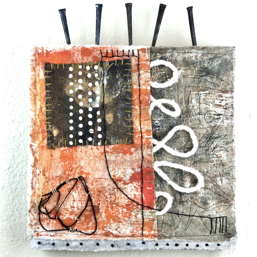These three Canvas Constuctions are part of my Intentional Simplicity Series…each 12x15x1.5 inches, painted and pieced canvas, hand and machine embroidered, and embellished on one side with square head nails.