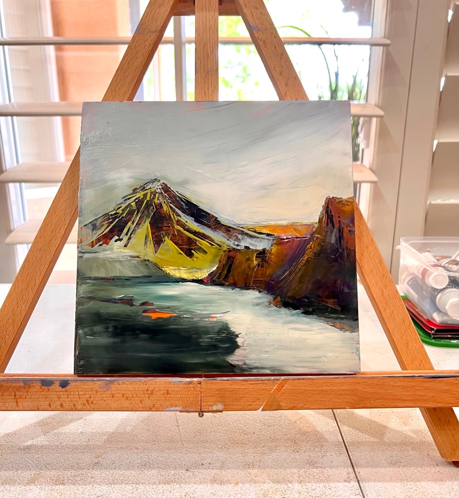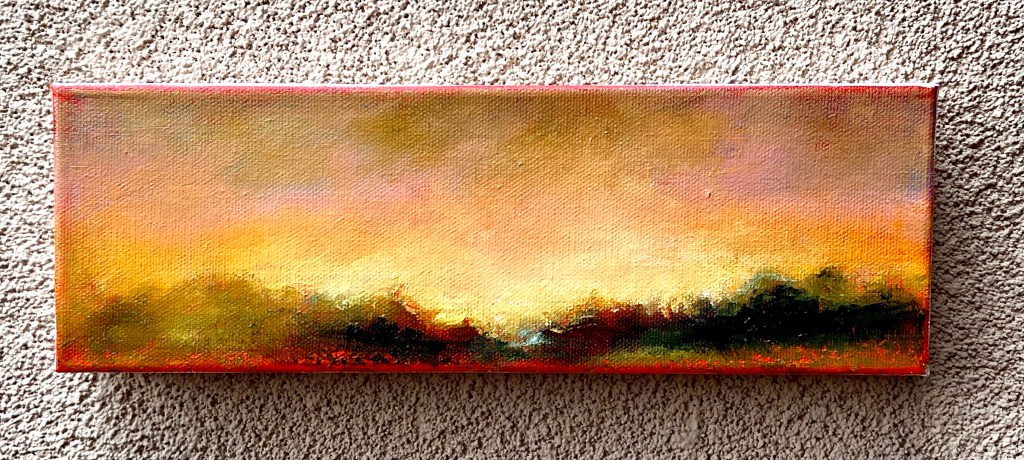 Last week, I began a quest to paint with oil paint, specifically oil sticks. Why? I love the purity of color and I want to plein aire paint without struggling to keep the acrylic paint wet. My first attempt:
