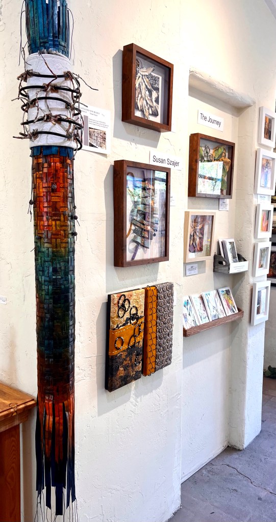 The show at the Capitol Rotunda Gallery has closed and I brought New Mexico Sunset to Jupiter Fine Art Gallery in Madrid. It is hanging in the perfect spot to lead the way to my framed textile work, my embroidered cards and “Petites in White”, my small acrylic paintings.