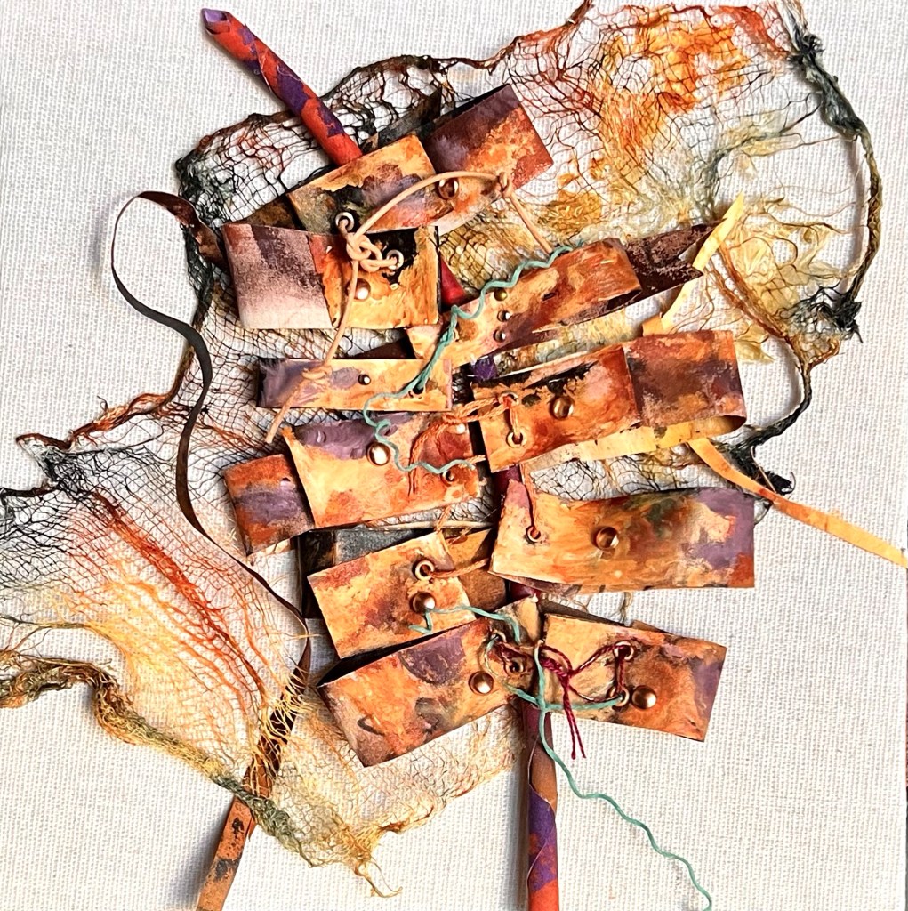 A new piece, Quandary…painted cotton, painted cheesecloth, cording, rolled painted cotton, brads and grommets. This piece is mounted on linen and framed in a light wooden shadow box frame.