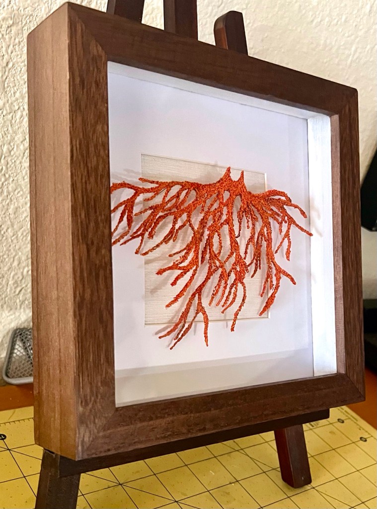 I have done a lot of free-motion quilting over the last 30 years (or longer) and have been wanting to get back to thread work. It took me a while to get acceptably proficient at the techniques involved in creating what I am calling THREAD SCULPTURES. By sewing repeatedly over the same stitching lines in a free-motion technique, and as long as every stitch intersects with another the thread skeleton will remain intact. I mount the finished sculpture on pins on a linen background so that beautiful shadows appear when the piece is lit. Each one is framed in a shadow box frame to protect its delicacy.