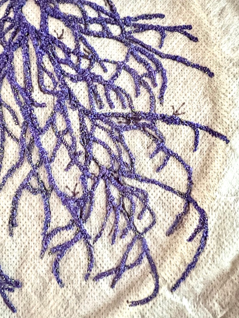 I tried a new (to me) water soluble fabric on this piece. I like that it is white as opposed to the more transparent film I have been using. I can draw my design before I stitch and can see it clearly…a BIG plus. I have a few more fabrics to try, but I think this one will remain as a contender.