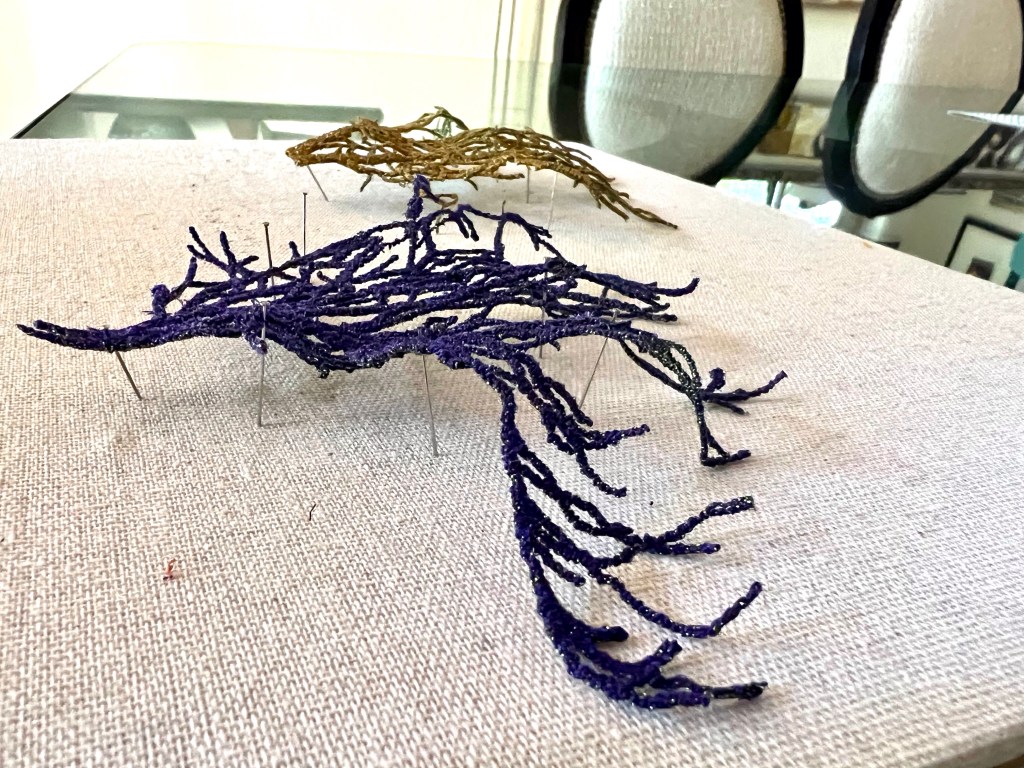 After I stitch and inspect again…and maybe again…I place the entire piece in a bowl of water and let the fabric dissolve, leaving the skeleton of thread. It’s then time to shape the piece while it is wet, pinning it in multiple places. As it dries, the shape will have some memory and will be easier to mount in its final position.