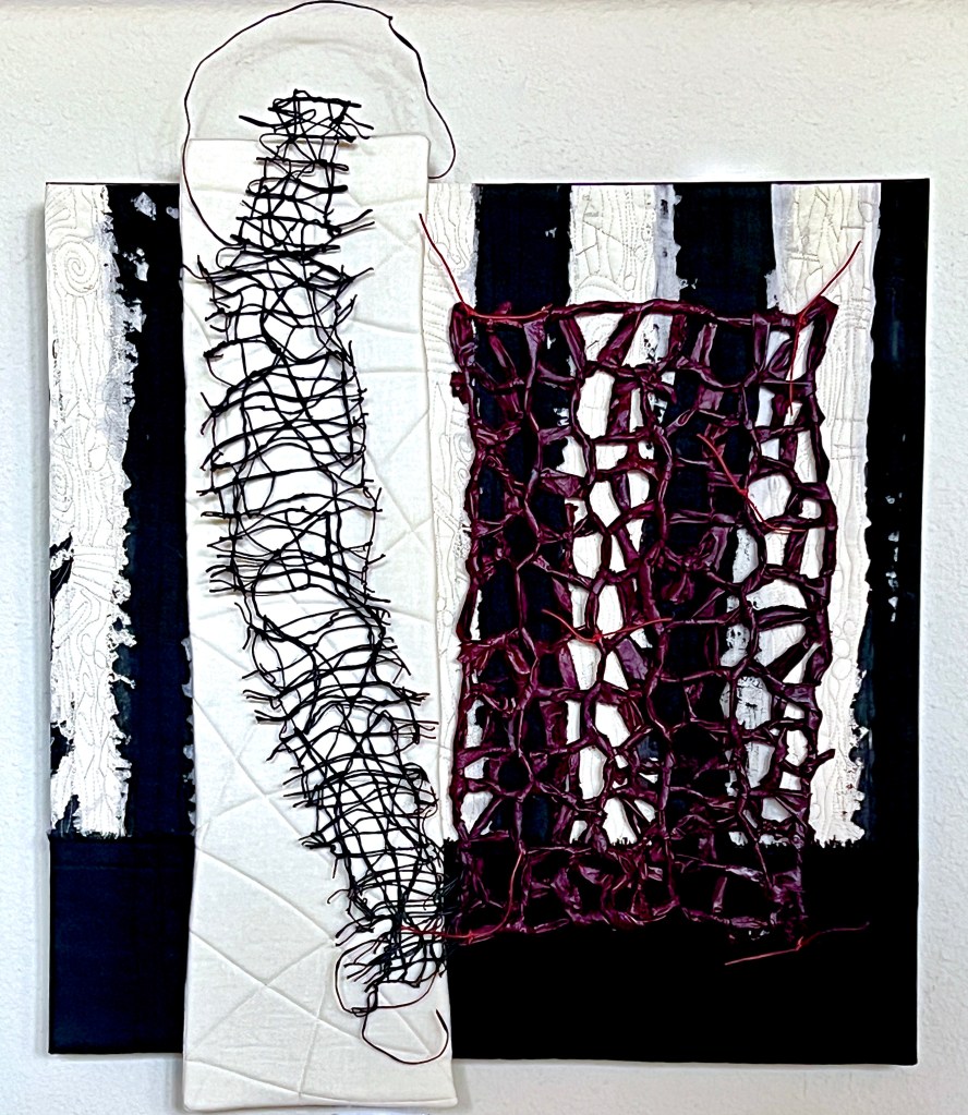 The white vertical piece is linen, quietly quilted and applied to the background. Atop the linen is an element I created a while ago using a random weave technique. It was intended for a free standing sculpture, but didn’t work as anticipated. It was perfect for this construction and I am so happy I save some things that I think will find a home somwhere.