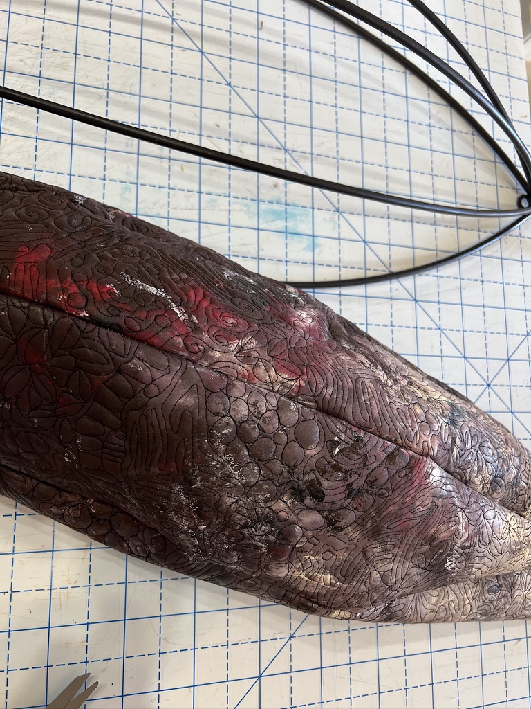 I painted some fabric…actually two layers painted together…to use to cover the armature. I wanted to make sure that after I quilted the cotton, the fabric would not droop when I sewed it together and covered the metal structure. Here it is cut to shape, ready to be quilted.