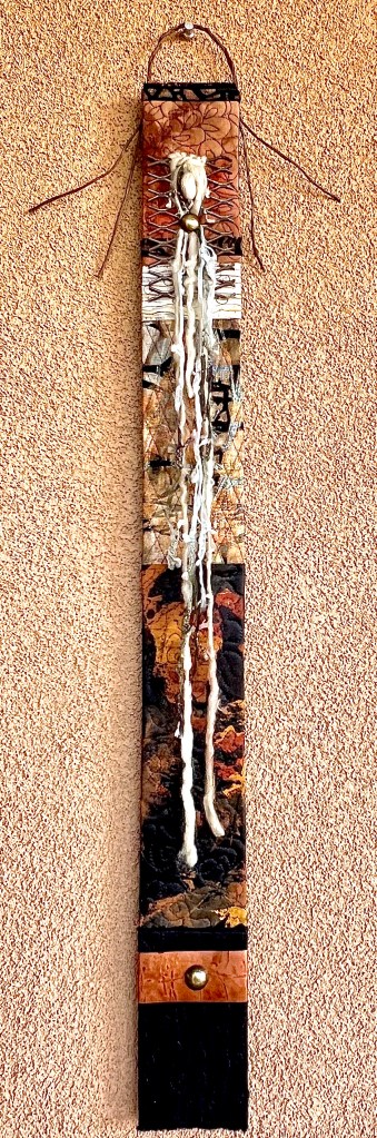 I made two new pieces…WINTER and SUMMER…totems on a smaller scale. They measure 3X30 inches (plus the hanger), still a significant size and shape. They are constructed in the same fashion as the larger totems, using my painted and printed fabrics, pieced, free motion quilted and then mounted to a canvas wrapped wood frame. I wanted these pieces to be hung from a covered wire with the ends left visible…fun and funky. I used round, brass upholstery tacks to attach the wire and to secure the embellishments on the front of each totem. Having the tacks embed in the wood frame makes things quite secure.