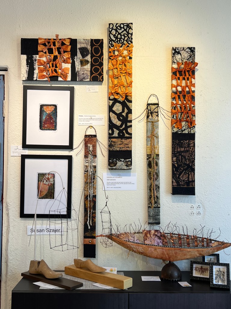 Here is a picture of them displayed along with the larger wrapped canvas constructions, a couple of framed textile embroideries and my sculptures. Seeing them side by side, my question to you is: