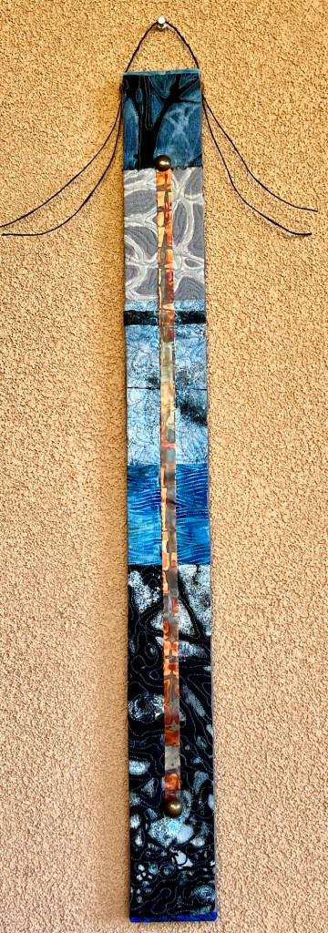 I am continuing to use my painted and printed fabric to create more totems, but am trying a few different types of embellishments. In this one, the central element is a beautifully patinated copper strip. I tried to capture the variation in color with the camera…it is close, but more striking in person.