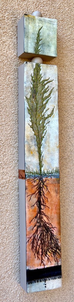 As you know, I have been focused on a tall and narrow presentation of my work. I think it is such a flexible piece of art in that it can be easily displayed in so many spaces. I mounted this embroidery on wood panels that I had “in stock” in my supply drawers. I so like the look, that I ordered more and will persue this presentaion in the future.