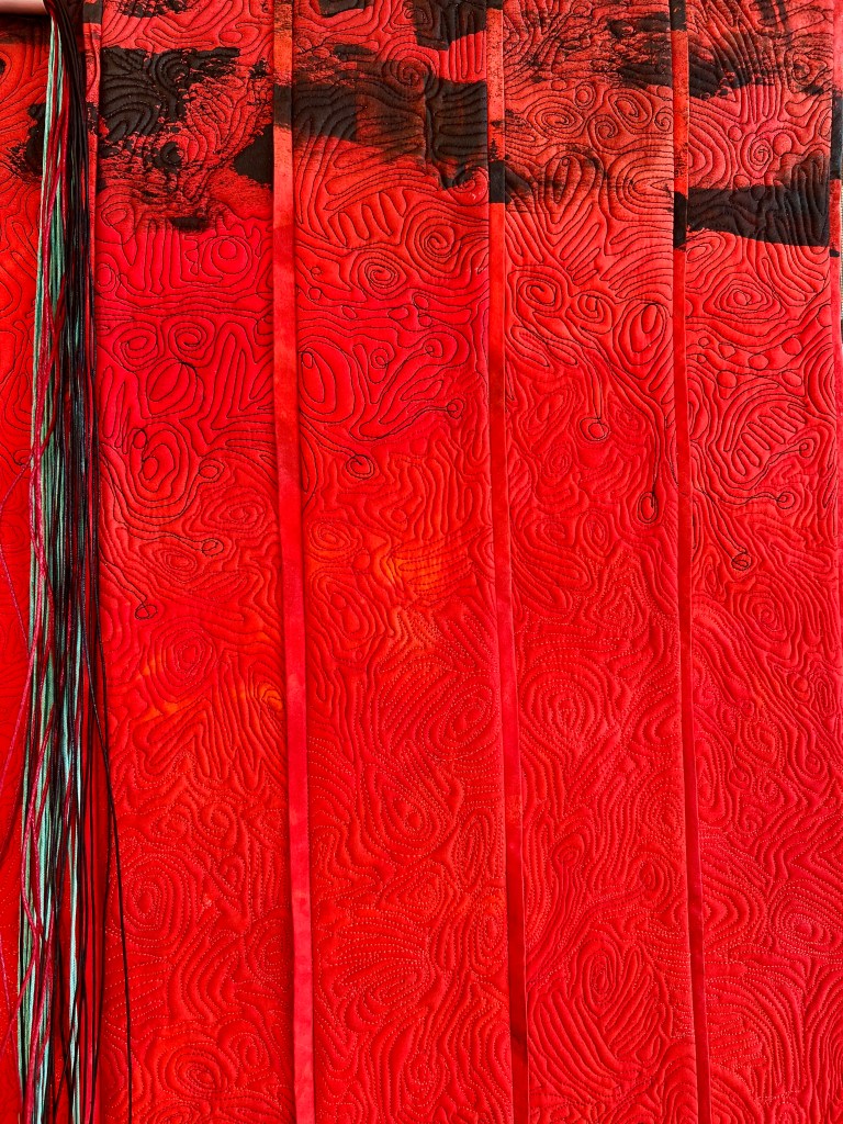 As you will see in the details, I implemented the two techniques that I described in a previous post about doing what I do best. Each piece is densely free motion machine quilted and embellished with a 3D element. It is quite enjoyable to work on these quilts…it has been a while since I have created bigger wall quilts with a specific connection for an exhibit. Admittedly, some of it has been experimentation with construction, but I think I have settled on a few methods that are appealing to me.