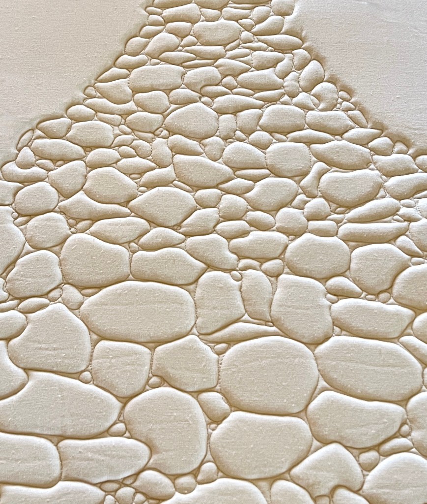 The above two detail shots are from the same piece entitled AGGREGATE…all linen. The next detail is a quick peek at an element in a more unusual quilted presentation…looking forward to revealing more…from the studio