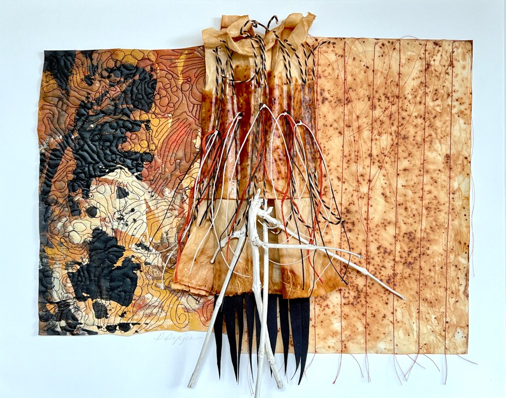 My piece, A WALK IN THE WOODS, is comprised of my hand painted and quilted fabric, rust dyed paper, stitching, cording and inked rice paper. It is mounted and housed in a 16×20 plexiglass frame. More information is available here.
