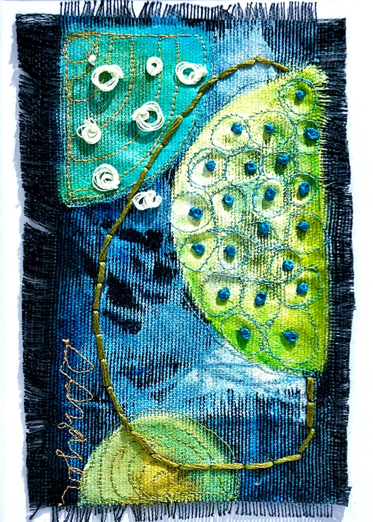 I enjoy each part of the process….painting the fabric, free-motion stitching, hand embroidering. The pieces look good framed and when hung in multiples. A gallery wall dotted with textile pieces…from the studio