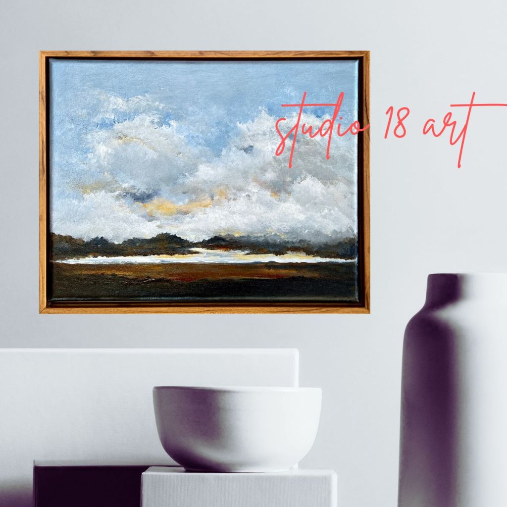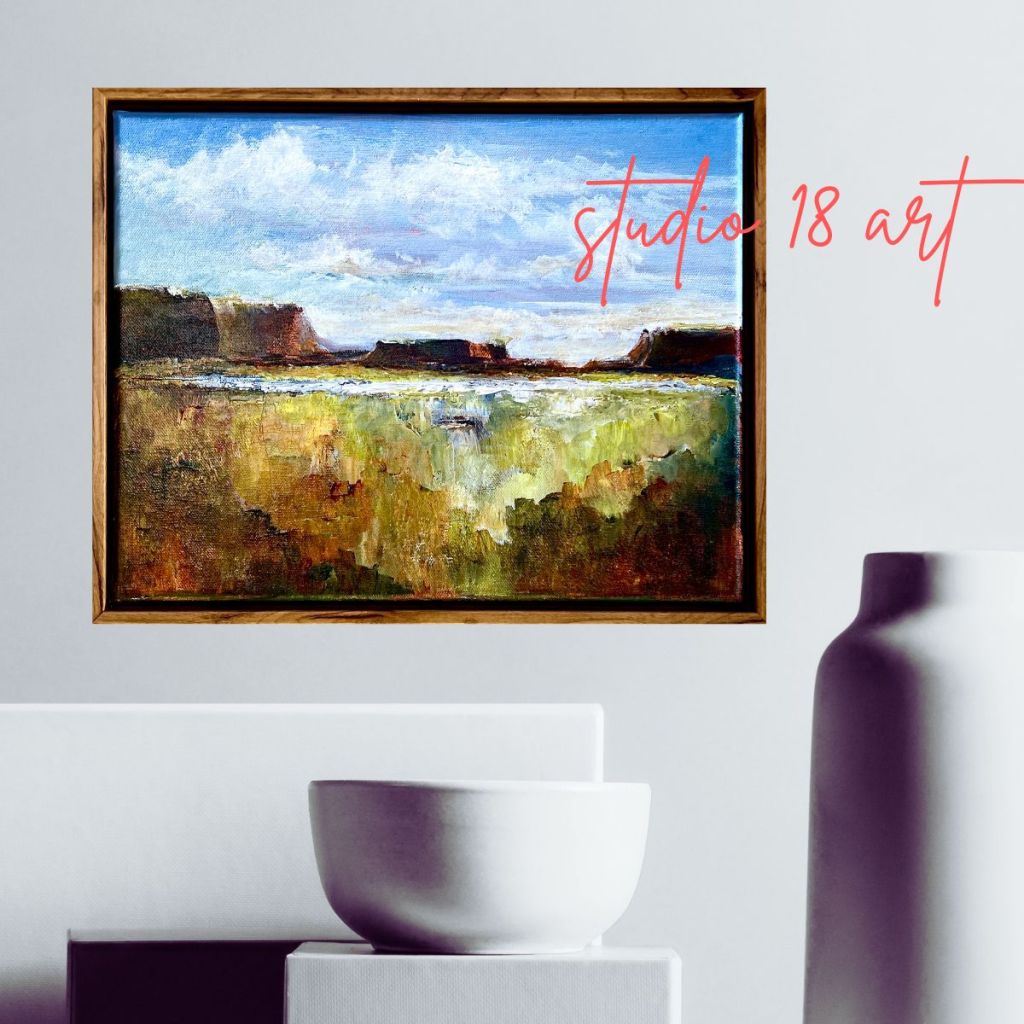 I haven’t posted paintings recently, so I would like to share two new paintings just delivered to Mostly Madrid Gallery in Madrid, NM. They are acrylic paintings on an 11×14 canvas mounted in a floater frame. I chose the walnut color frame for these two paintings since both have a warmer color palette. The top one is MIST and the bottom is BLUFFS above the Pecos.