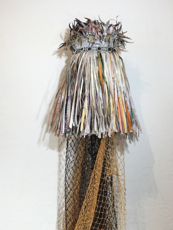 LONGTAIL, mixed media, 33x12x9, metal armature, dyed cheesecloth, woven paper yarn, patinated copper strips, cording, dyed paper, found metal support … More