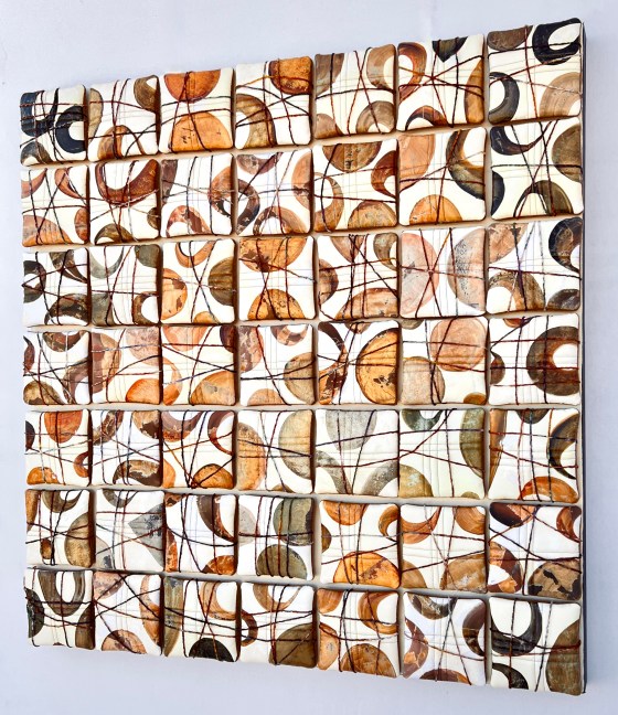 49 painted squares, quilted, pillowed, wrapped and arranged on a 36×36 inch gallery canvas CHAOS One of six pieces completed … More