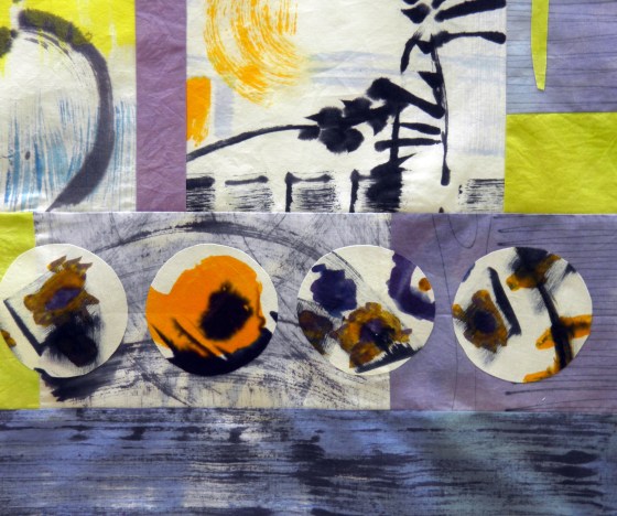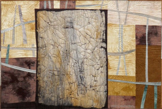 NIGHT TRAFFIC, another construction quilt mounted on stretcher bars. I dyed much of this fabric in dark, rich colors so I could … More