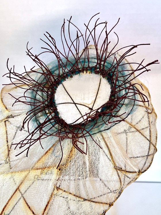 This pod was an exercise utilizing aluminum wire and my own painted fabric and paper. In finding the orange “spring”, … More