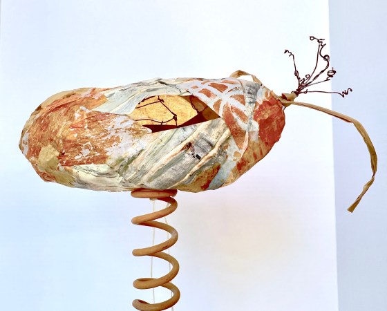 This pod was an exercise utilizing aluminum wire and my own painted fabric and paper. In finding the orange “spring”, … More