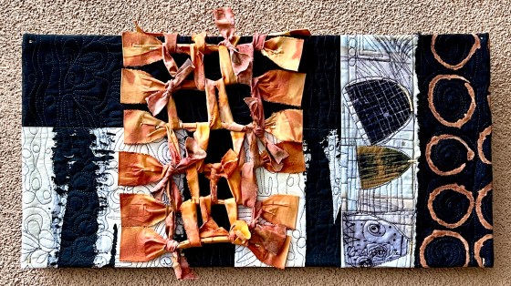 A favorite done with gold metallic thread, covered by black and rust colored free motion stitching. I did many…hundreds…of stitched … More